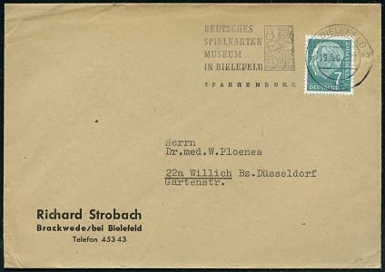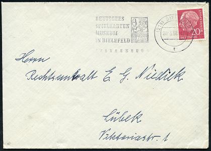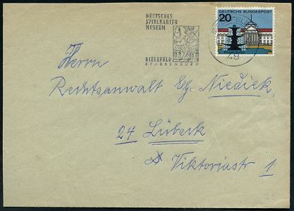 8436 | 12 € | 4800 Bielefeld Maschinen- u. Serienstempel : 48 BIELEFELD 2/ p/ DEUTSCHES/ SPIELKARTEN/ MUSEUM.. 1962 (4.8.) MWSt (Eichel-König) Bedarfs-Bf. (Bo.23 A V = UB "p" und neue PLZ) | ![]() | |