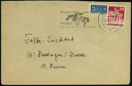 8430 | 16 € | 4800 Bielefeld Maschinen- u. Serienstempel : BIELEFELD/ t/ 14.+ 15.5./ PFERDE-/ LEISTUNGSSCHAU 1949 (12.5.) MWSt = Springreiter (u. Wappen) klar gest. Inl.-Bf. (Bo.9 A) | ![]() | |
