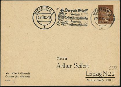 8426 | 30 € | 4800 Bielefeld Maschinen- u. Serienstempel : BIELEFELD 2/ z/ "Der gute Brief"/ fordert/ deutliche u. vollständige/ Angabe d./ Empfängers u.Absen-ders 1942 (24.11.) seltener MWSt (Altmünster. Briefbote mit Hund) auf PP 3 Pf. Hitler (A. Seifert, kl. Beförd.-Spuren, kl. Rißchen) + 2K-Steg , gute Stempel-abdrucke sehr selten! (Bo.S 395 A, nur 2 1/2 Monate in nur 4 Orten) | ![]() | |