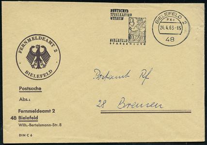 8437 | 12 € | 4800 Bielefeld Maschinen- u. Serienstempel : 48 BIELEFELD 2/ x/ DEUTSCHES/ SPIELKARTEN/ MUSEUM 1963 (24.4.) MWSt (Eichel-König) auf Postdienst-Bf.: FERNMELDEAMT 2.. (Ortsdruck) Fern-Bf. (Bo.23 A XI = UB "x") | ![]() | |