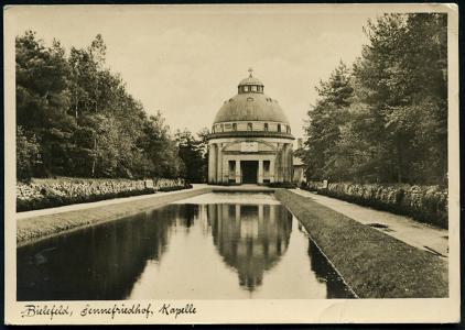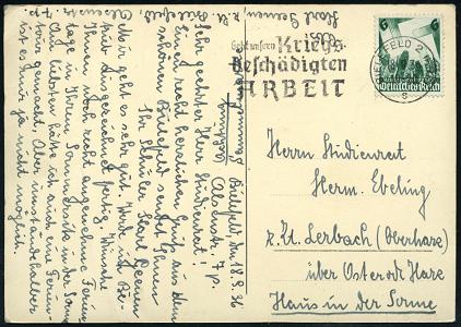 8424 | 18 € | 4800 Bielefeld Maschinen- u. Serienstempel : BIELEFELD 2 (HBF)/ s/ Gebt unseren Kriegs-/ beschädigten/ ARBEIT 1935 (18.9.) Serien-MWSt auf EF 6 Pf. Reichsparteitag , s/w.-Foto-Ak.: Sennefriedhof Kapelle, Bedarf, vergl. Kat.-Nr.8451 (Bo.S 152 A, nur in 6 Orten von 1934-37 verwendet) | ![]() ![]() | |