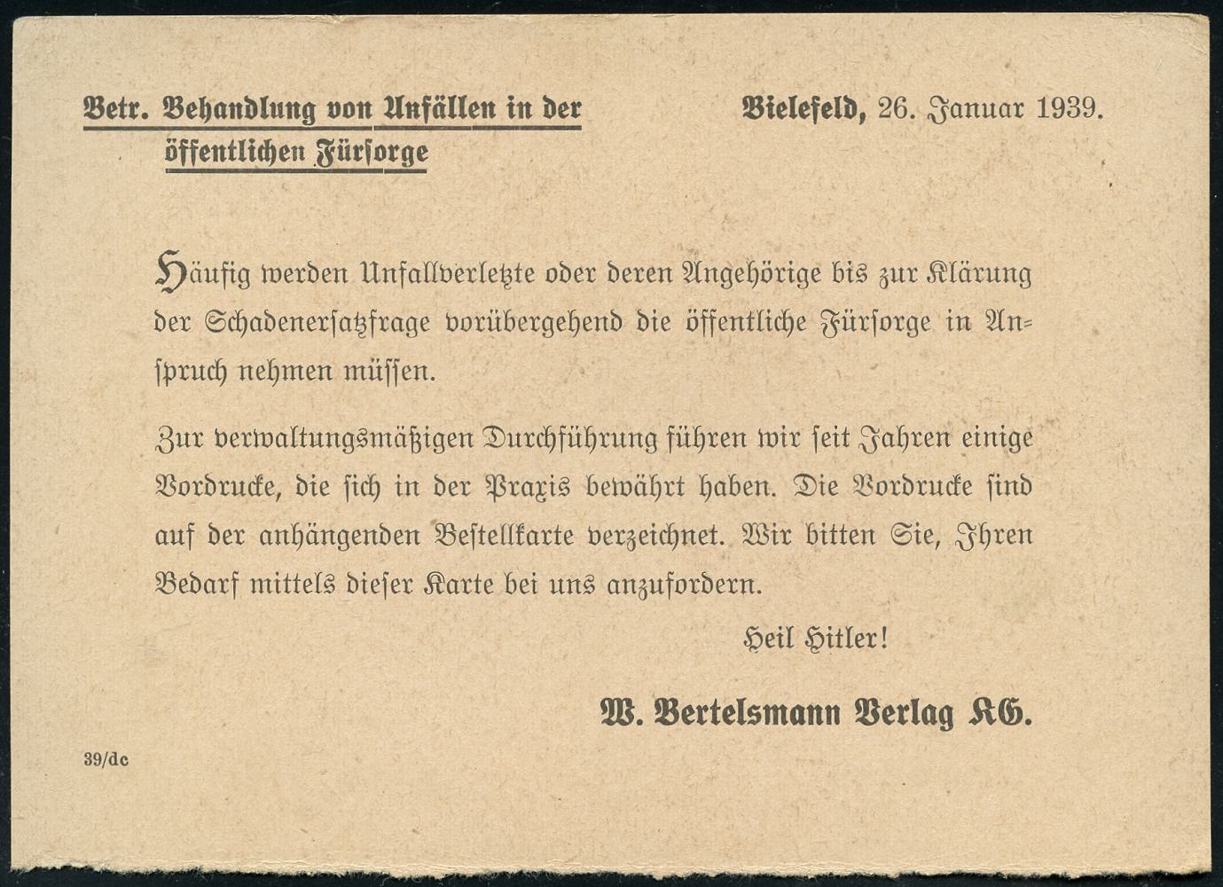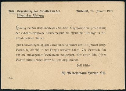 8454 | 14 € | 4800 Bielefeld Post-Freistempel : BIELEFELD 2/ p/ DEUTSCHES REICH 1939 (27.1.) PFS "Achteck" auf (halber) Reklame-Kt. für Formulare zur Erfassung von Unfällen.. mit Zusatz "Heil Hitler!" (Dü.D-4) | ![]() ![]() ![]() | |