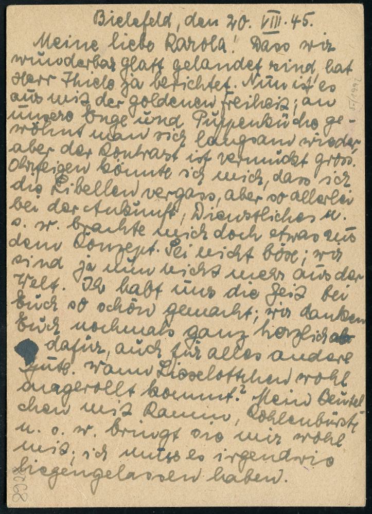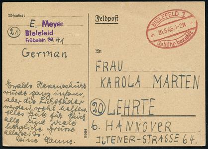 8458 | 30 € | 4800 Bielefeld Post-Freistempel : BIELEFELD 1/ **/ Gebühr bezahlt 1945 (20.8.) roter Oval-Brücken-PFS auf provis., aptierter "Feldpost"-Bedarfs-Kt. n. Lehrte, früher Nachkriegs-Barfrankaturs-Beleg! (Dü.A-5, Nr.17) | ![]() ![]() | |