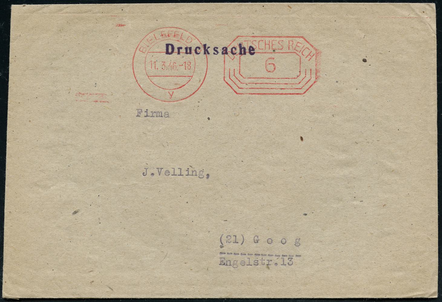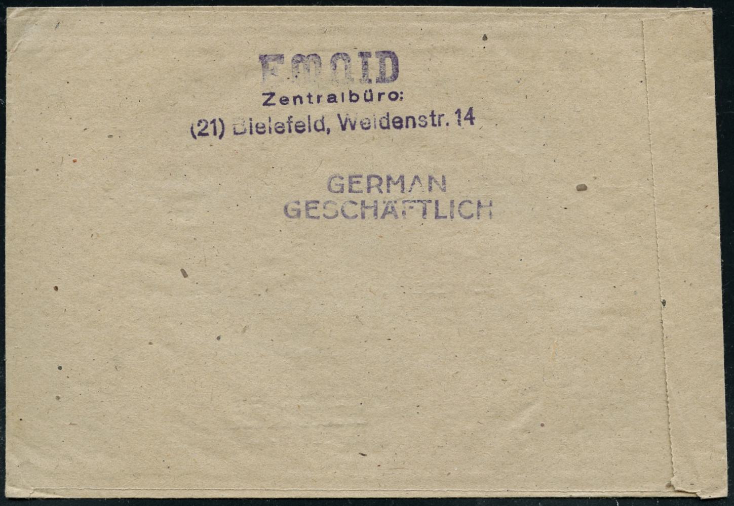 8459 | 18 € | 4800 Bielefeld Post-Freistempel : BIELEFELD 2/ y/ DEUTSCHES REICH 1946 (11.3.) PFS "Achteck DEUTSCHES REICH" unverändert weiterverwendet = Notmaßnahme! , rs. Abs.-3L: EMOID, Zentralbüro.. (Dü.D-4, unverändert weiterverwendet) | ![]() ![]() | |