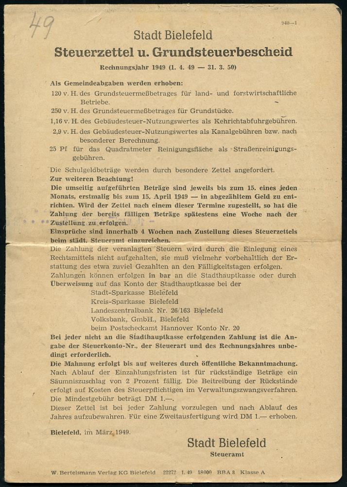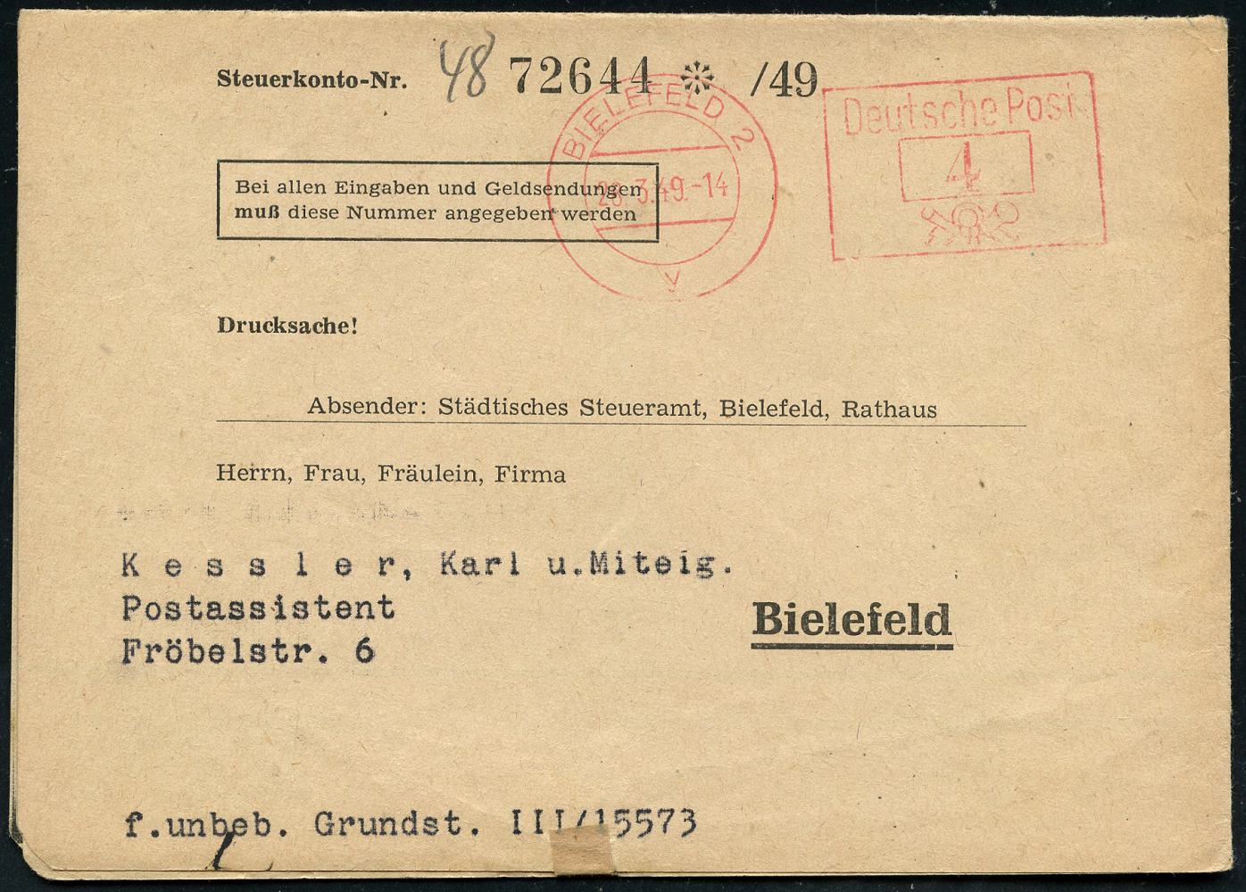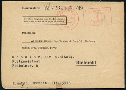 8461 | 15 € | 4800 Bielefeld Post-Freistempel : BIELEFELD 2/ y/ Deutsche Post 1949 (28.3.) PFS Querrechteck "Posthorn" , kommunaler Falt-Bf.: Stadt Bielefeld, Steuerzettel u. Grundsteuerbescheid + Rechnungsbescheid in DM (1x kl. Riß geschl.) Orts-Bf. (Dü.D-14, Nr.267) | ![]() ![]() ![]() | |