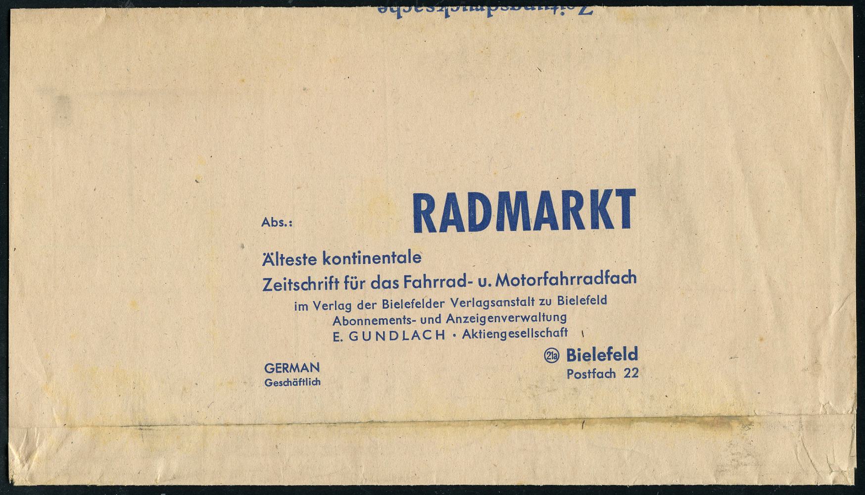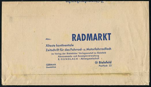 8462 | 18 € | 4800 Bielefeld Post-Freistempel : BIELEFELD 2/ y/ Deutsche Post 1949 (21.7.) PFS Querrechteck "Posthorn" 10 Pf. auf Zeitungs-Streifband, rs. Abs.: RADMARKT, Älteste kontinentale Zeitschrift für das Fahrrad- u. Motorfahradfach.. E. GUNDLACH, seltene Portostufe! (Dü.D-14) | ![]() ![]() | |