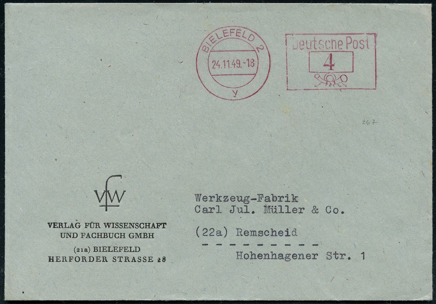 8463 | 8 € | 4800 Bielefeld Post-Freistempel : BIELEFELD 2/ y/ Deutsche Post 1949 (24.11.) PFS Querrechteck "Posthorn" 4 Pf. auf Firmen-Bf.: VERLAG FÜR WISSENSCHAFT U. FACHBUCH GMBH.. (Dü.D-14) | ![]() | |