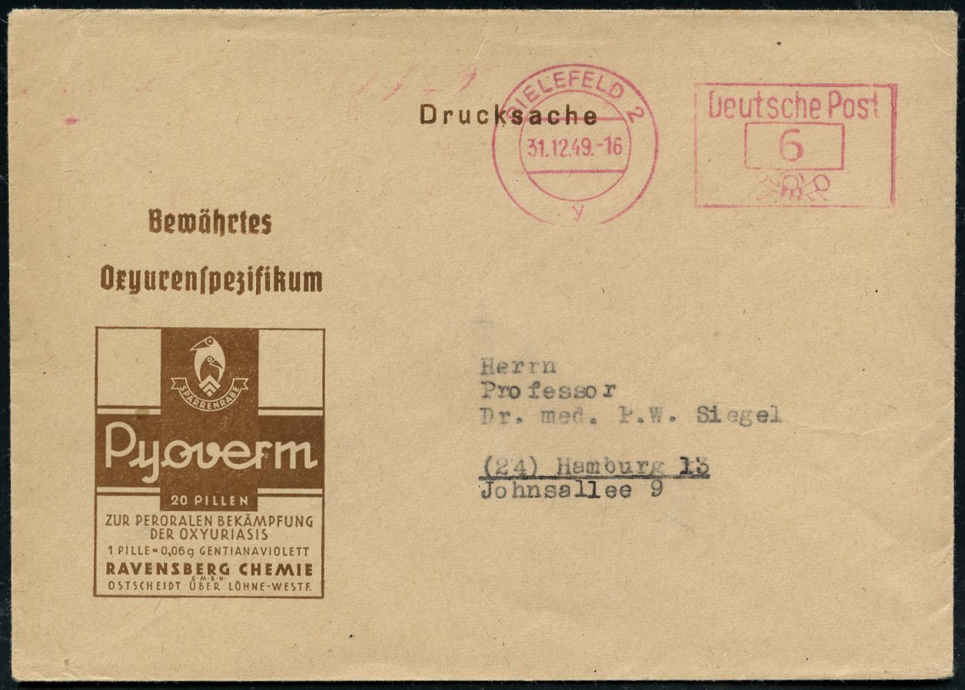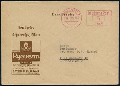 8464 | 10 € | 4800 Bielefeld Post-Freistempel : BIELEFELD 2/ y/ Deutsche Post 1949 (31.12.) PFS Querrechteck "Posthorn" auf Reklame-Bf.: Bewährtes Oxyurenspezificum.. Pyoverm.. REVENSBERG CHEMIE (Dü.D-14) | ![]() | |