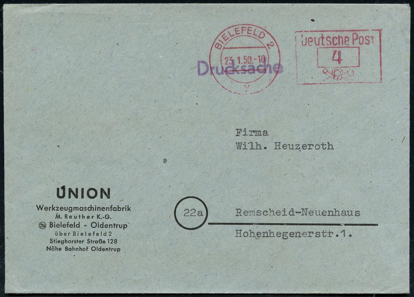 8465 | 8 € | 4800 Bielefeld Post-Freistempel : BIELEFELD 2/ y/ Deutsche Post 1950 (23.1.) PFS Querrechteck "Posthorn" auf Firmen-Bf.: UNION Werkzeugmaschinenfabrik, M. Reuther KG.. (Dü.D-14) | ![]() | |