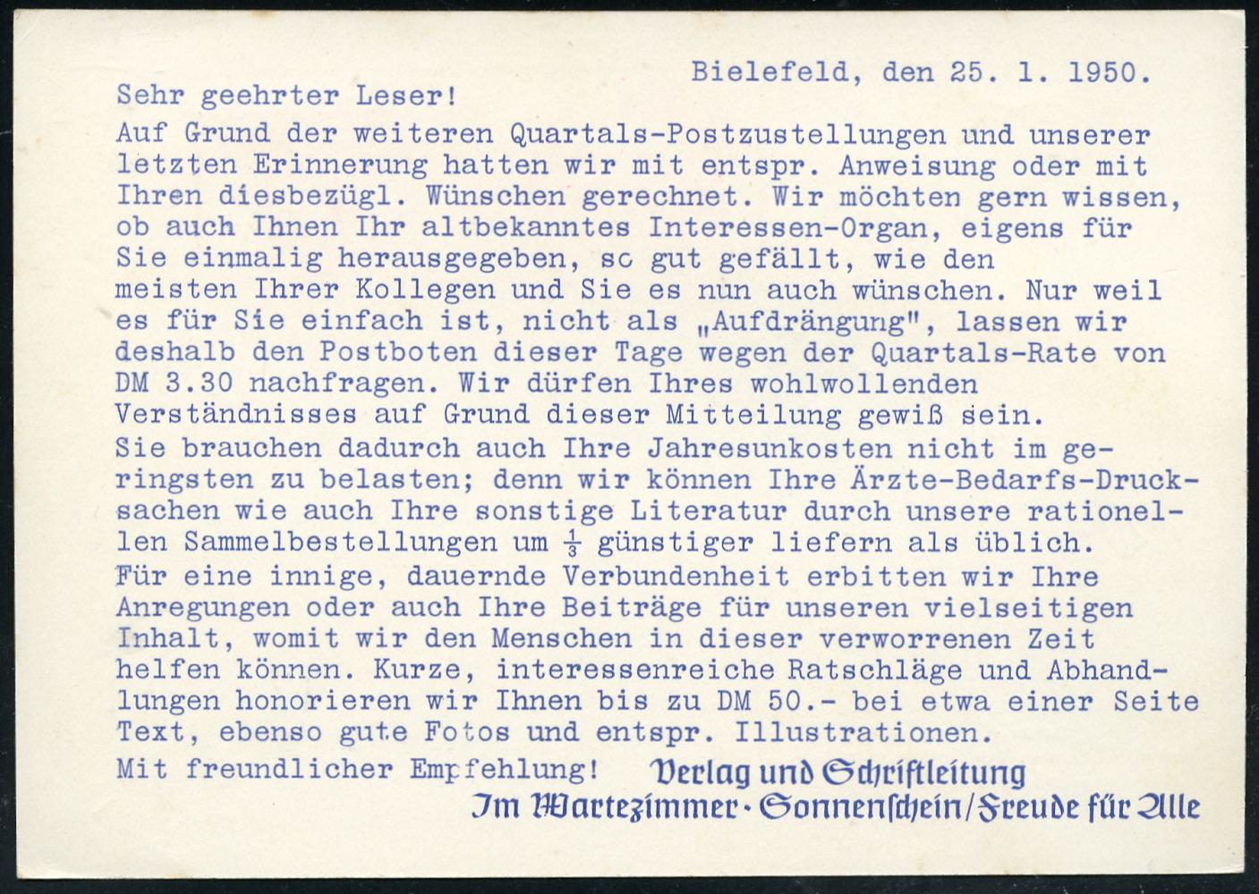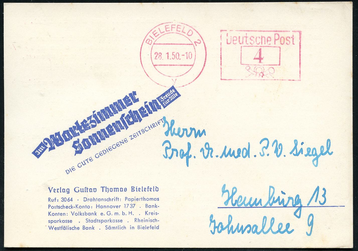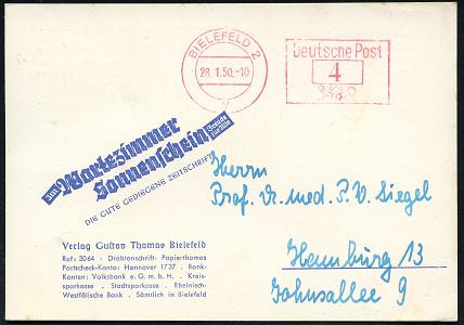 8466 | 10 € | 4800 Bielefeld Post-Freistempel : BIELEFELD 2/ y/ Deutsche Post 1950 (28.1.) PFS Querrechteck "Posthorn" auf Reklame-Kt.: Jm Wartezimmer, Sonnenschein.. Verlag Gustav Thomas.. (Dü.D-14) | ![]() ![]() | |