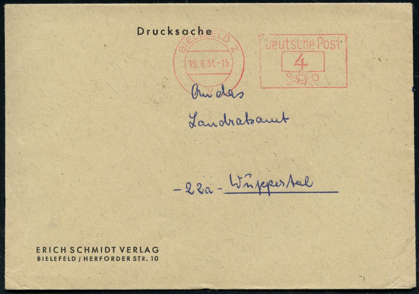 8469 | 8 € | 4800 Bielefeld Post-Freistempel : BIELEFELD 2/ y/ Deutsche Post 1951 (19.8.) PFS Querrechteck "Posthorn" auf Firmen-Bf.: ERICH SCHMIDT VERLAG.. (Dü.D-14) | ![]() | |