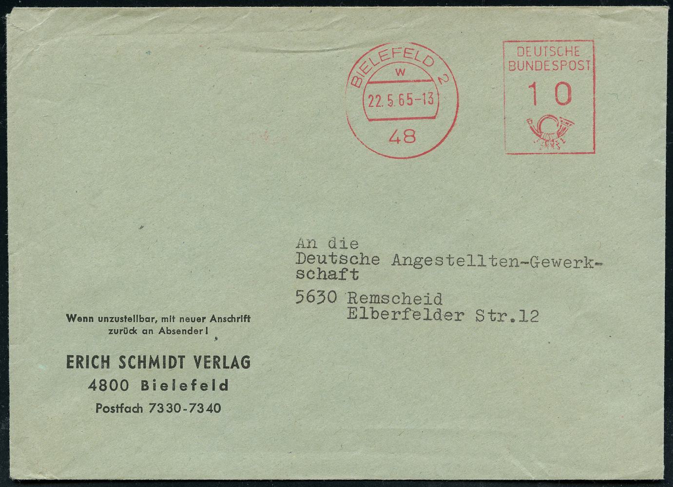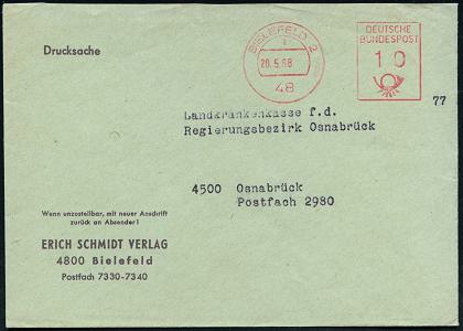 8472 | 8 € | 4800 Bielefeld Post-Freistempel : 48 BIELEFELD 2/ w/ DEUTSCHE/ BUNDESPOST 1965 (22.5.) PFS Hochrechteck "Posthorn" mit neuer PLZ u. Uhrzeit , Firmen-Bf.: ERICH SCHMIDT VERLAG.. (Dü.D-17, UB "w") | ![]() | |