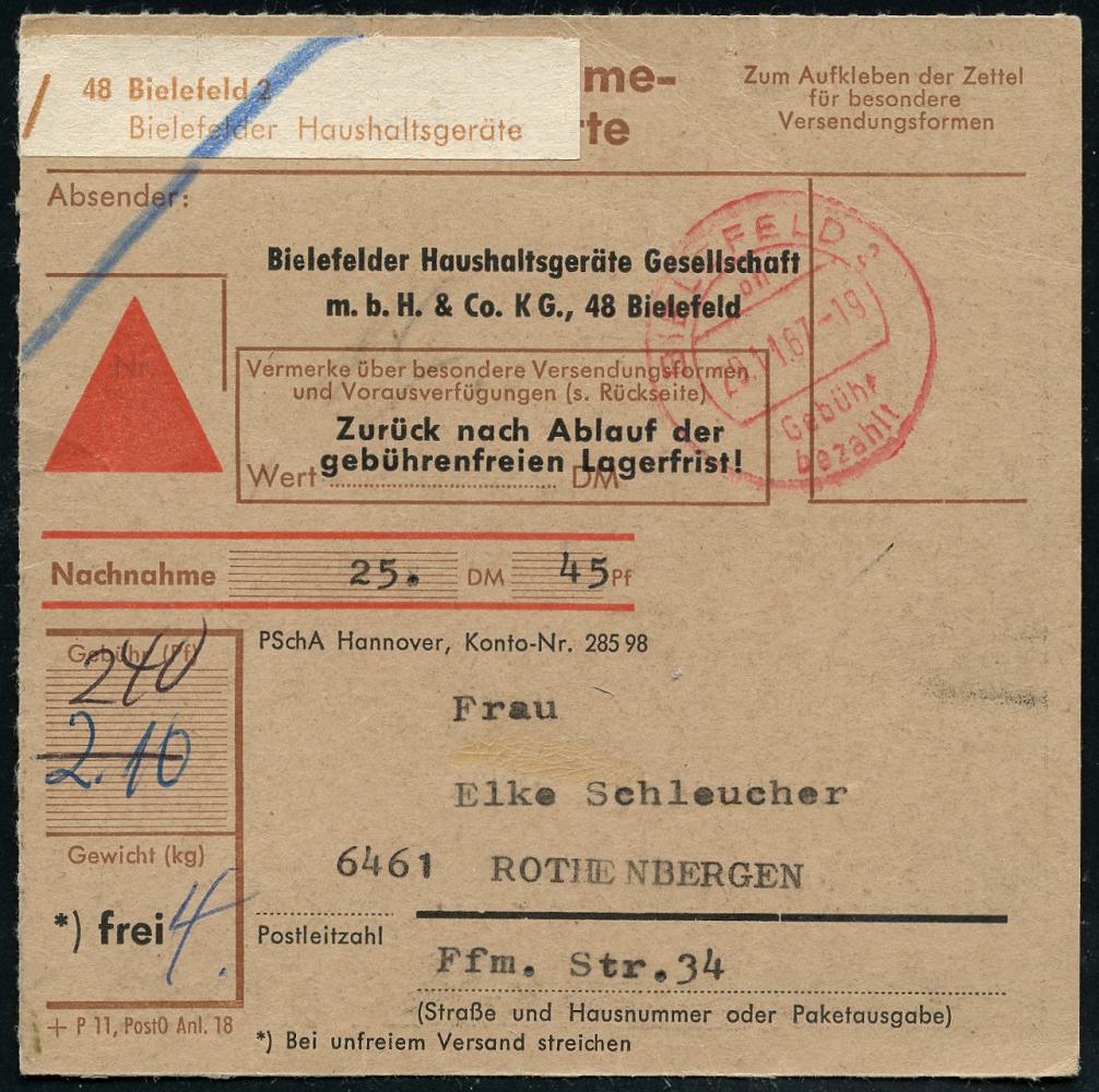 8473 | 18 € | 4800 Bielefeld Post-Freistempel : BIELEFELD 2/ oh/ Gebühr/ bezahlt 1967 (29.11.) 1K-Segment-PFS ohne PLZ + brauner Selbstbucher-Paketzettel: 48 Bielefeld 2/ Bielefelder Haushaltsgeräte , Inl.-NN-Selbstbucher-Paket-Kt. n. Rothenbergen (Dü.-Eich unbekannt) | ![]() | |