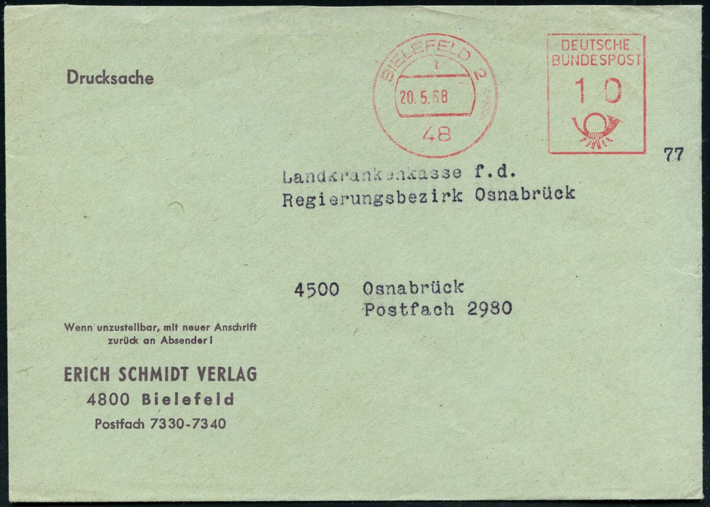 8474 | 7 € | 4800 Bielefeld Post-Freistempel : 48 BIELEFELD 2/ t/ DEUTSCHE/ BUNDESPOST 1968 (20.5.) PFS Hochrechteck "Posthorn" ohne Uhrzeit auf Firmen-Bf.: ERICH SCHMIDT VERLAG.. (rs. Klappe fehlt) (Dü.D-17 UB "t") | ![]() | |