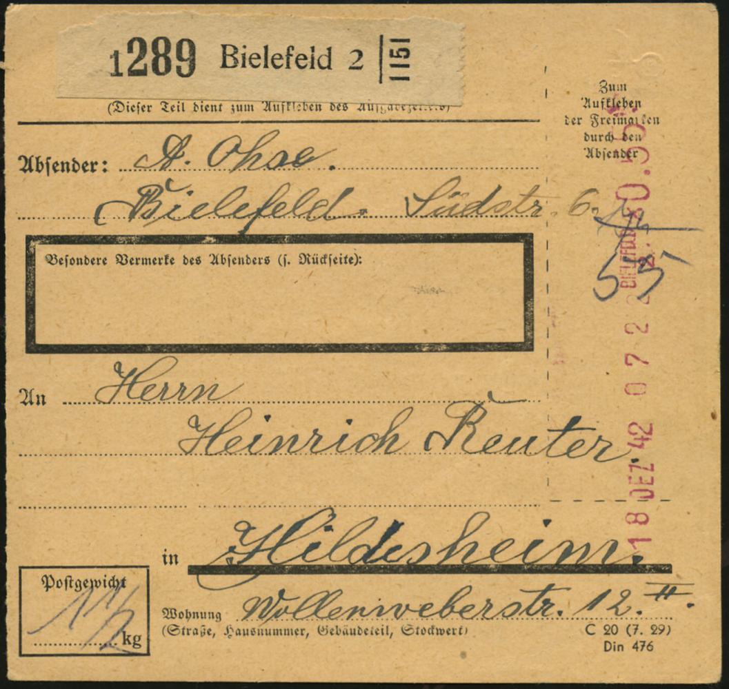 8456 | 25 € | 4800 Bielefeld Post-Freistempel : BIELEFELD/ 2 1942 (18.12.) Anker-Registrierkassen-PFS *0.55 RM + NS-Prägeadler vertikal + schw. Paketzettel: Bielefeld 2, Inl.-Paketkt. n. Hildesheim (Dü.H-1A / 2) | ![]() | |