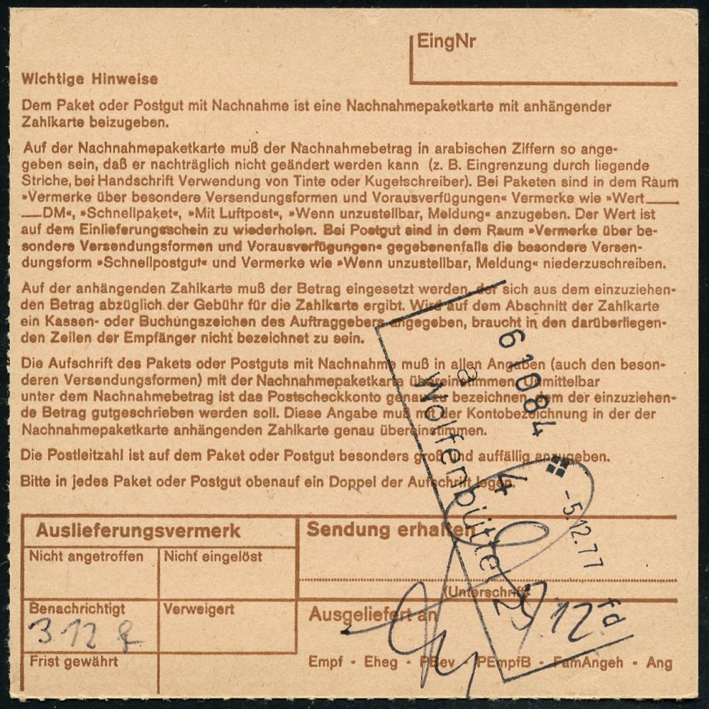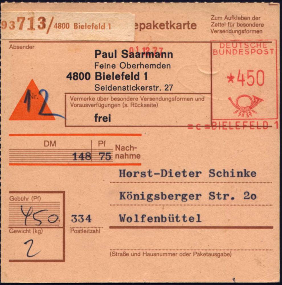 8475 | 18 € | 4800 Bielefeld Post-Freistempel : =c= BIELEFELD 1 1977 (1.12.) Maschinen-Paket-FS Francotyp "Posthorn" ohne PLZ *450 Pf. + brauner Paketzettel: 4800 Bielefel 1 , klar gest. Inl.-NN-Paket-Kt. n. Wolfenbüttel, rs. Paginier-AS.: Wolfenbüttel 2 (Dü.H-6C) | ![]() ![]() | |