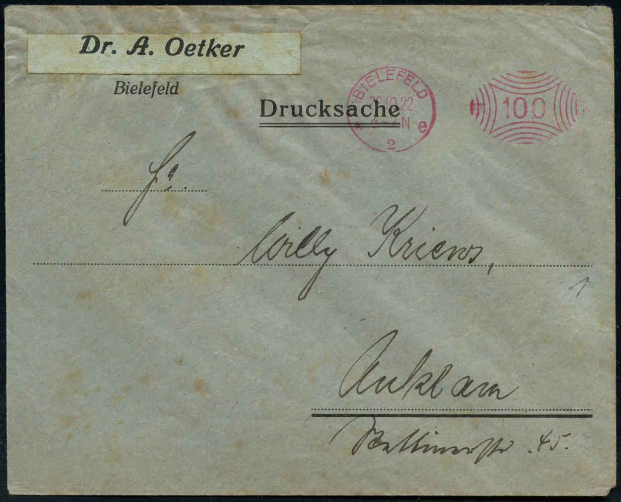 8441 | 18 € | 4800 Bielefeld Post-Freistempel : BIELEFELD/ * 2 e 1922 (26.10.) Infla-PFS "Ziermuster" 100 (Pf.) auf überklebtem Firmen-Bf.: Dr. A. Oetker n. Anklam (Dü.D-1, Nr.15) | ![]() | |
