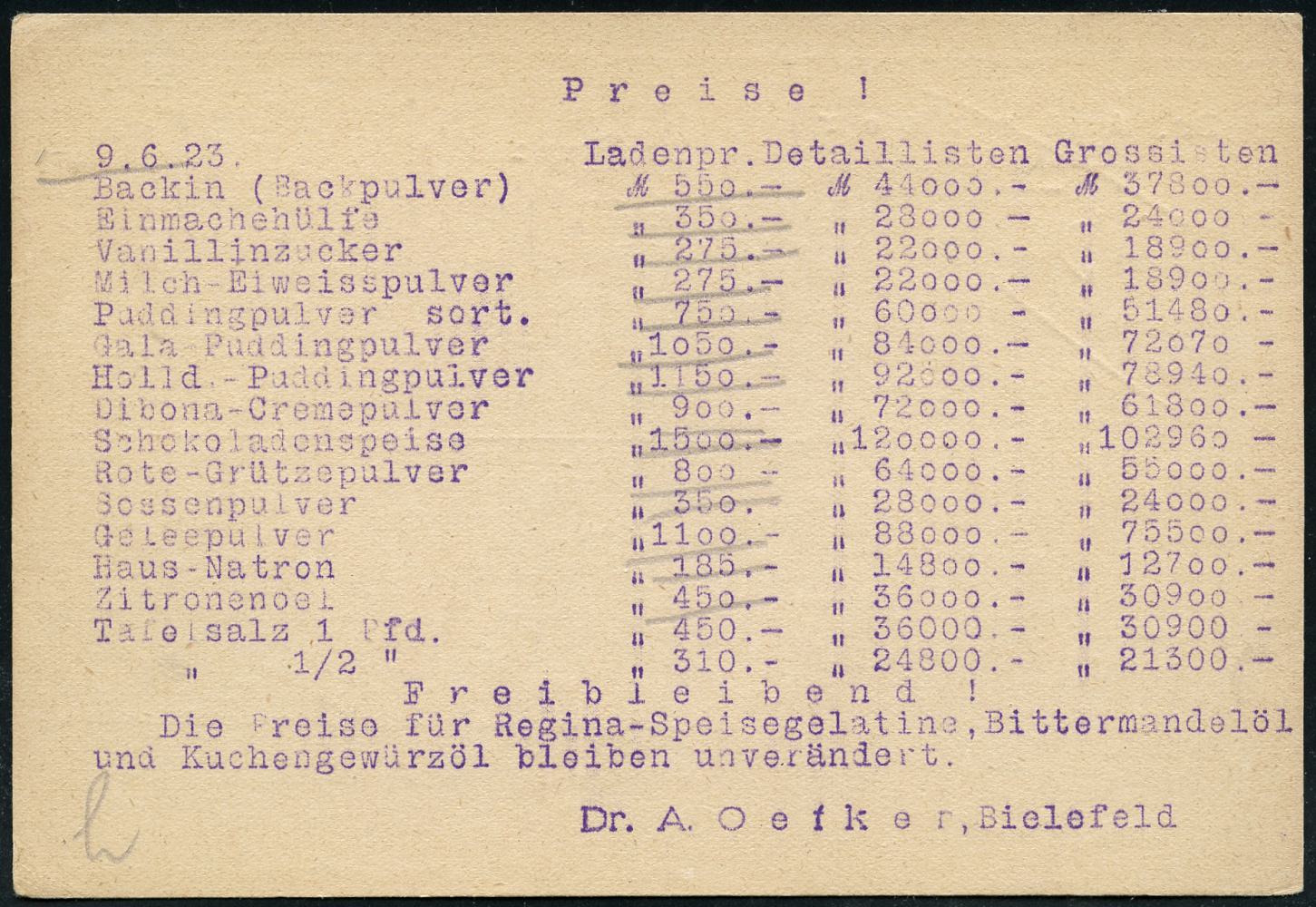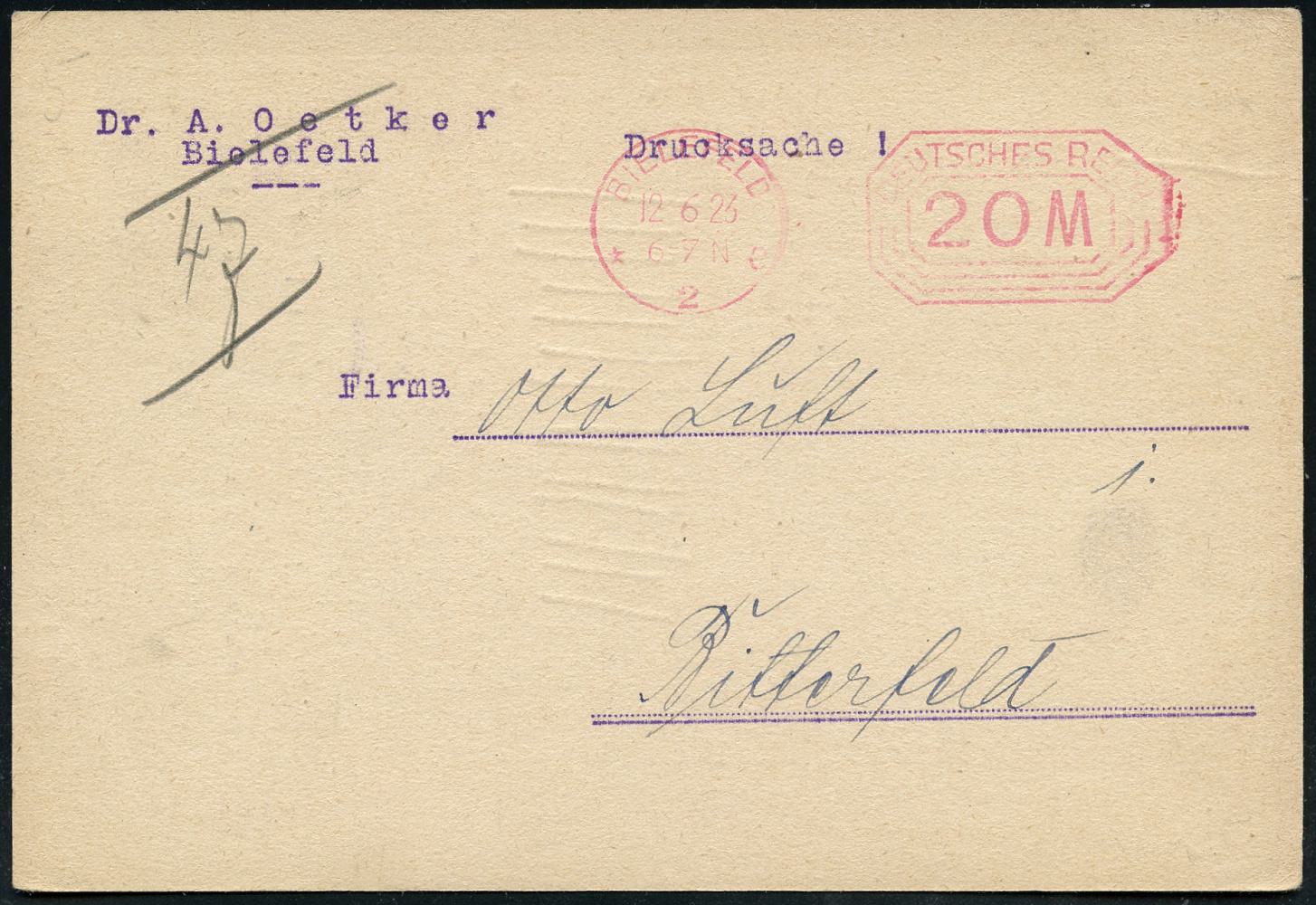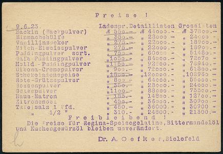 8443 | 16 € | 4800 Bielefeld Post-Freistempel : BIELEFELD/ *2e/ DEUTSCHES REICH 1923 (12.6.) Infla-PFS "Achteck" 10 M (ark) auf Infla-Firmen-Kt.: Dr. A. Oetker mit Infla-Preisen zu Aromen und Nahrungsmittel-Zusätzen (Dü.D-3, Nr.44) | ![]() ![]() | |
