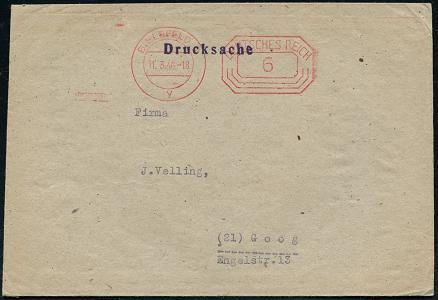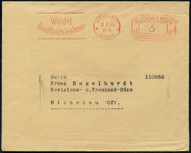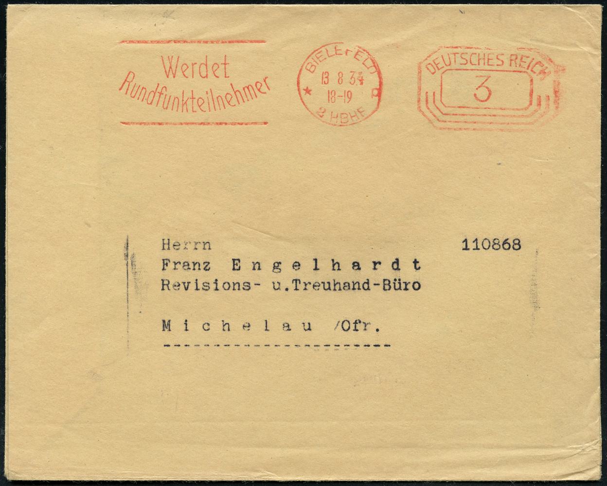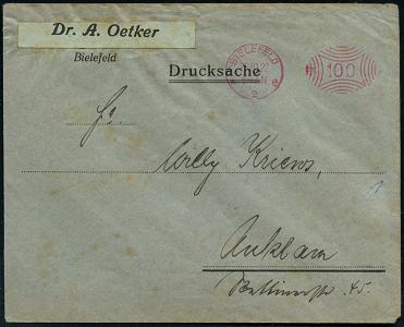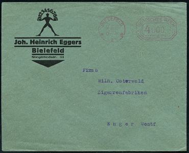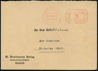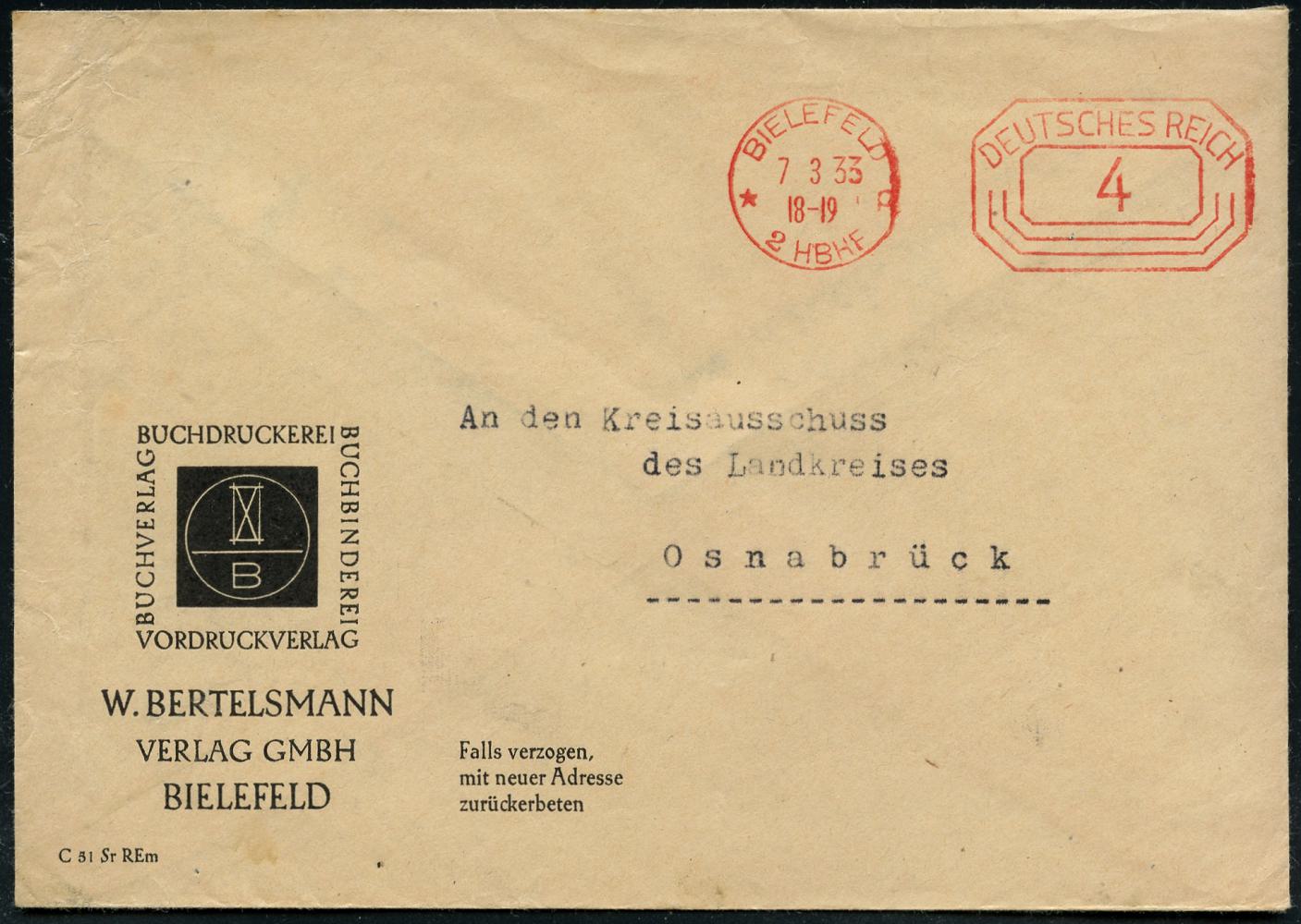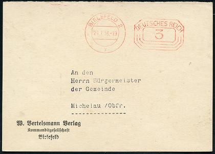 8449 | 10 € | 4800 Bielefeld Post-Freistempel : BIELEFELD/ *p/ 2 HBF/ DEUTSCHES REICH 1933 (7.3.) PFS "Achteck" 4 Pf. auf Firmen-Bf.: W. BERTELSMANN VERLAG GMBH.. mit Firmen-Logo (Dü.D-4) | ![]() | |