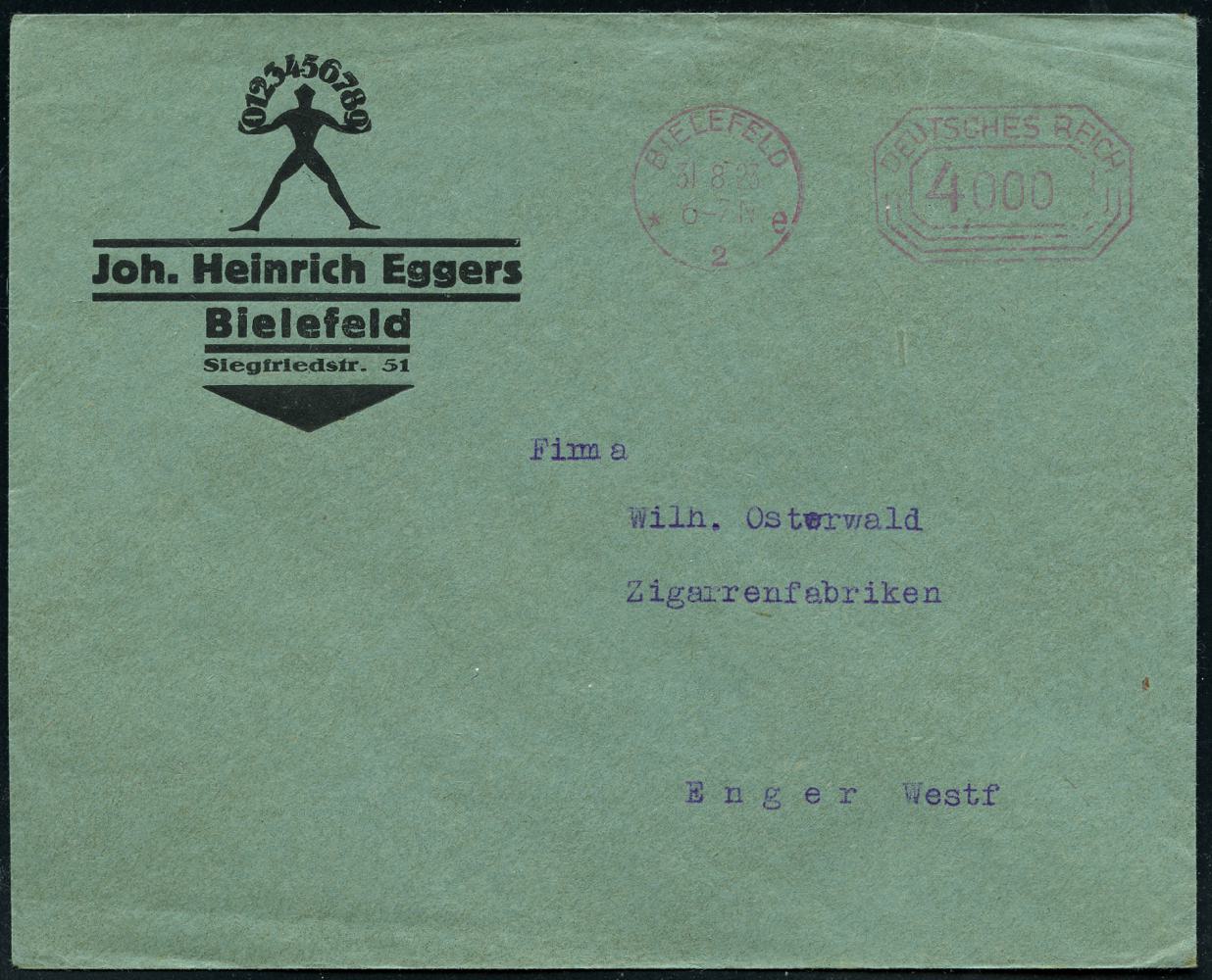 8444 | 20 € | 4800 Bielefeld Post-Freistempel : BIELEFELD/ *2e/ DEUTSCHES REICH 1923 (31.8.) Infla-PFS "Achteck" 4000 (Mark) auf dekorativem Firmen-Bf.: Joh. Heinrich Eggers.. mit Zahlen-Jongleur (Dü.D-3, Nr.88) | ![]() | |