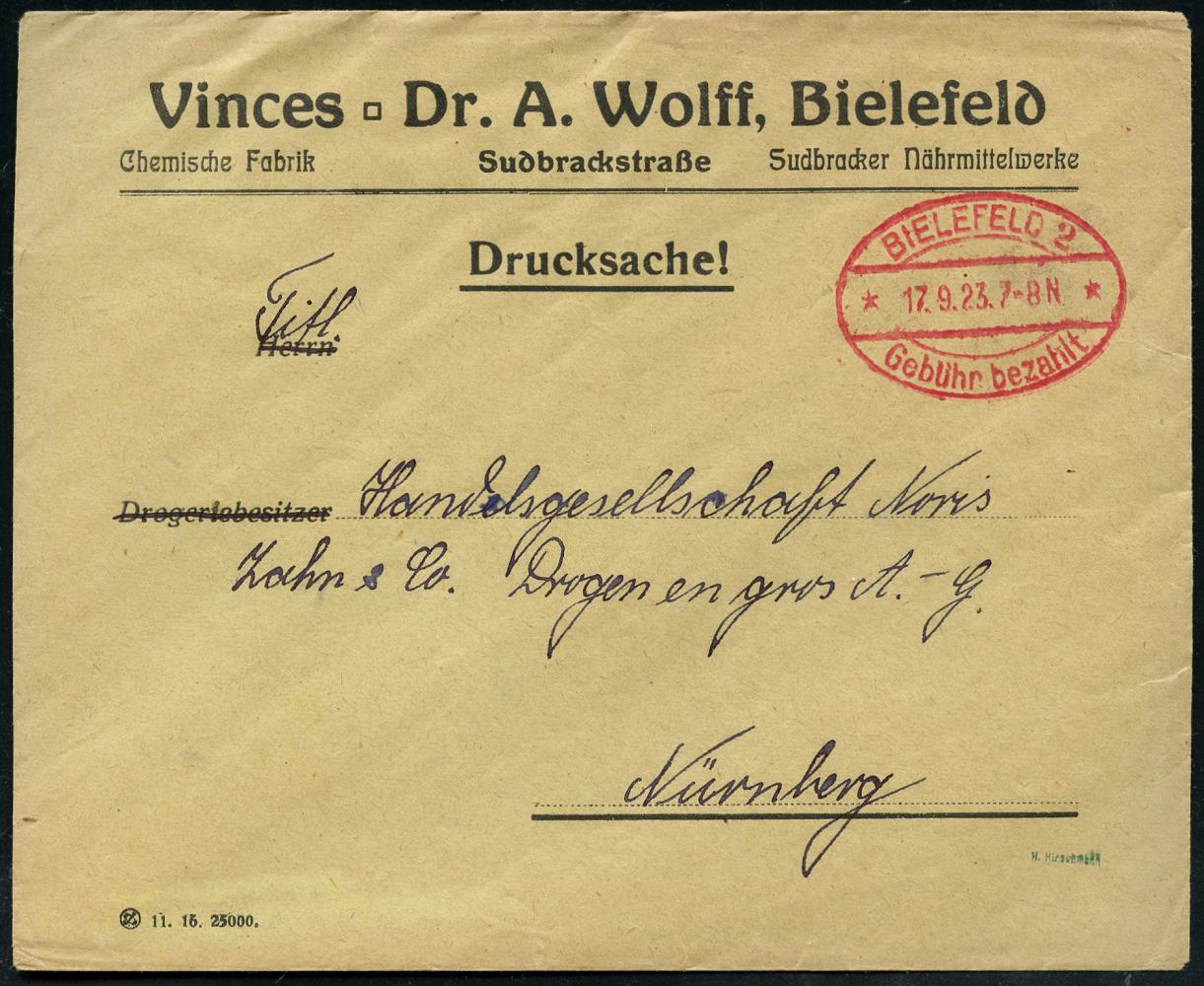 8445 | 16 € | 4800 Bielefeld Post-Freistempel : BIELEFELD/ **/ Gebühr bezahlt 1923 (17.9.) Oval-Brücken-PFS mit Uhrzeit auf Firmen-Bf.: Vinces Dr, A. Wolff.. Chemische Fabrik, Sudbracker Nährmittekwerke (Dü.A-15, Nr.17) | ![]() | |