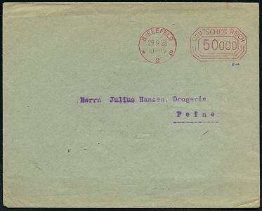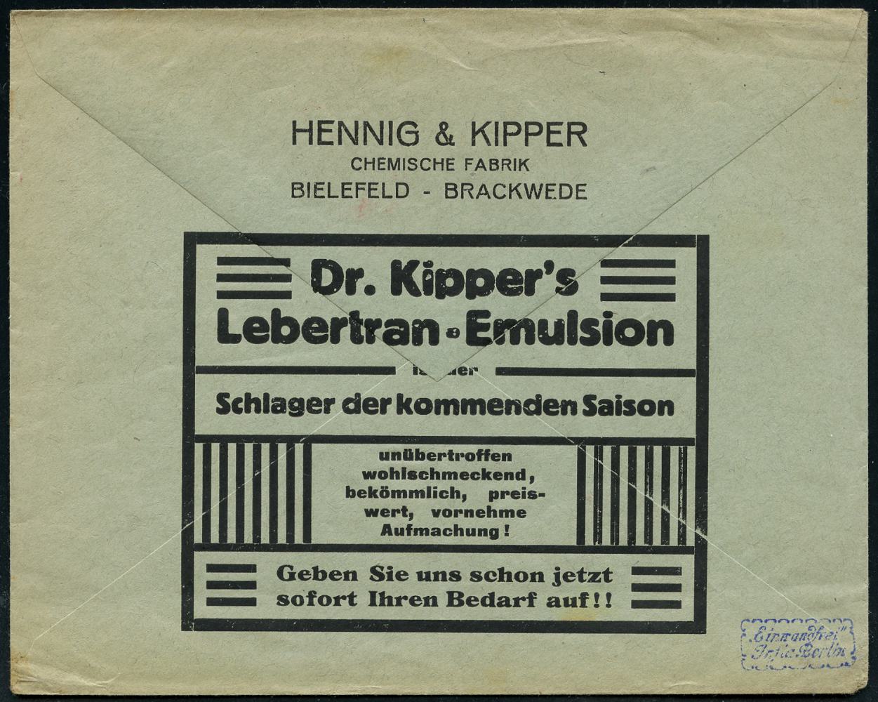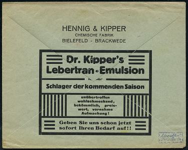 8446 | 25 € | 4800 Bielefeld Post-Freistempel : BIELEFELD/ *2e/ DEUTSCHES REICH 1923 (29.9.) Infla-PFS "Achteck" 50ooo (Mark) auf Firmen-Reklame-Bf.: HENNIG & KIPPER; CHRMISCHE FABRIK mit Reklame für Lebertran-Emulsion, gepr. Infla (Dü.D-3, Nr.99) | ![]() ![]() | |