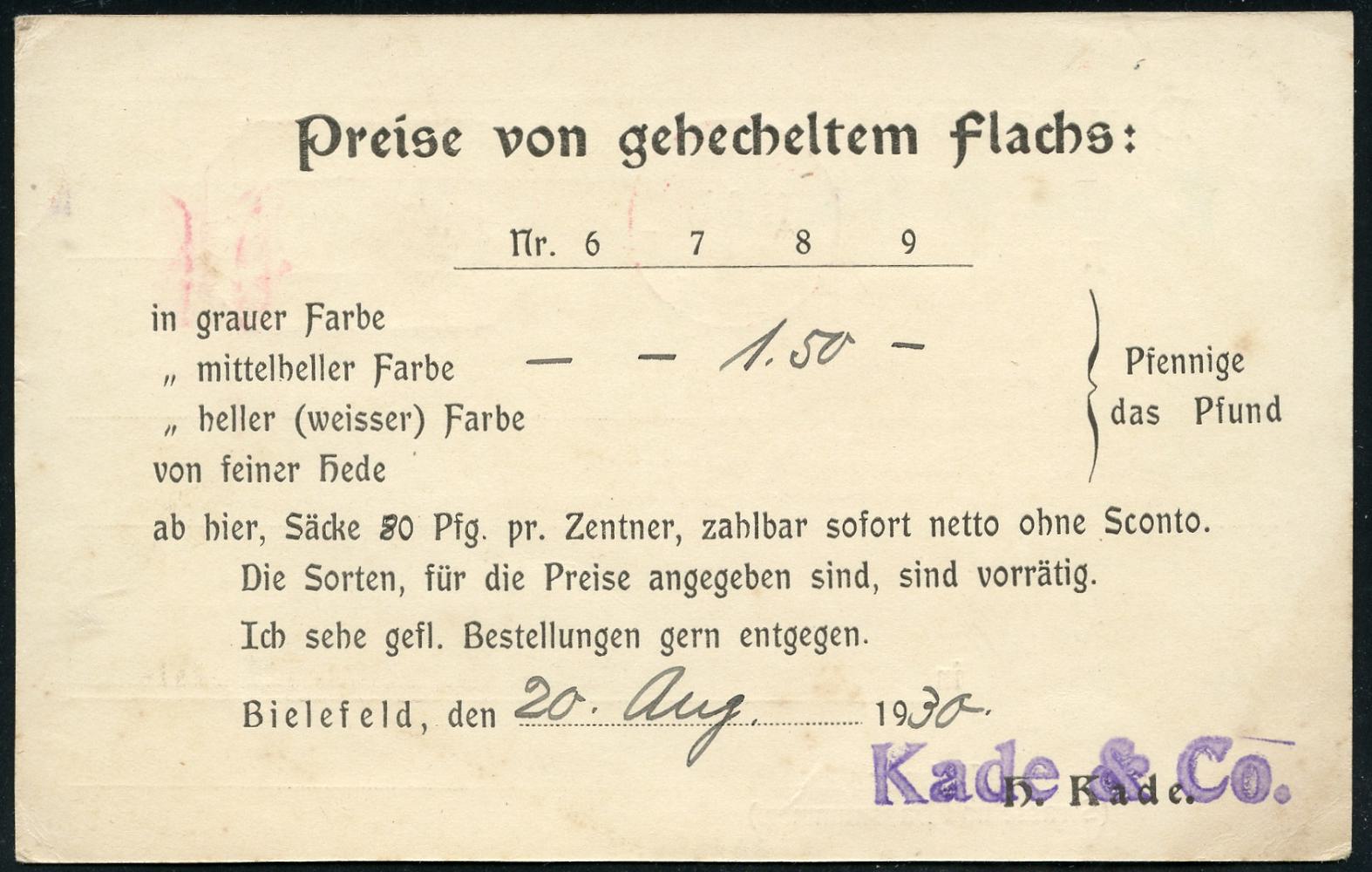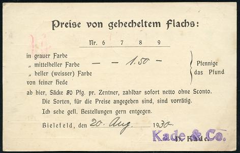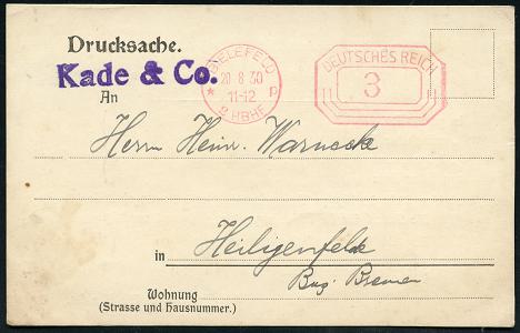 8448 | 15 € | 4800 Bielefeld Post-Freistempel : BIELEFELD/ * p/ 2 HBF/ DEUTSCHES REICH 1930 (20.8.) PFS "Achteck" 3 Pf. auf Firmen-Kt.: Kade & Co., Preise von gehecheltem Flachs.. (Dü.D-4) | ![]() ![]() | |