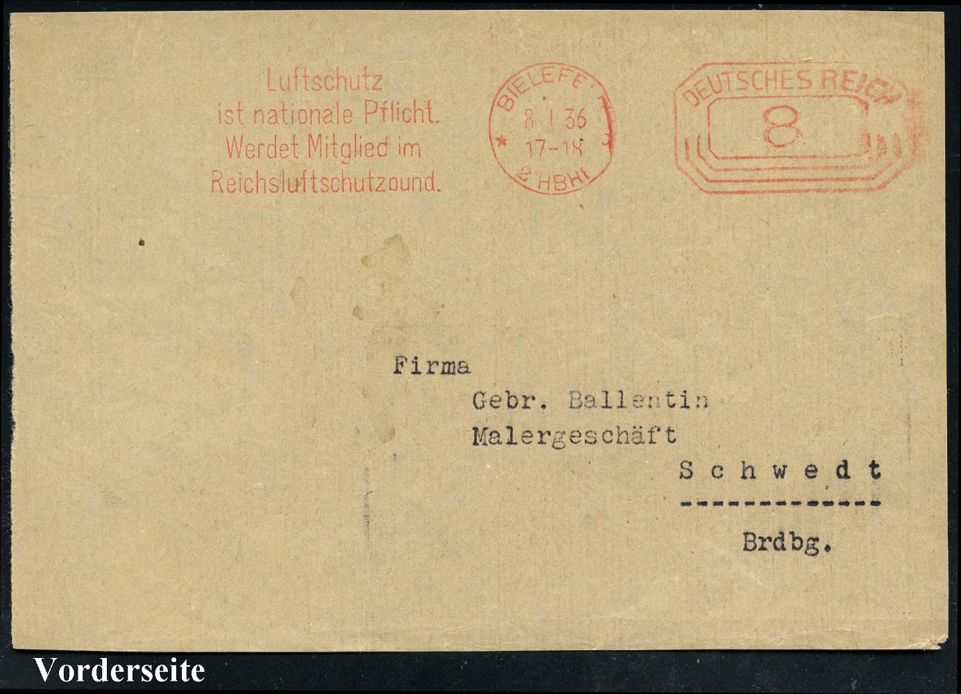 8452 | 18 € | 4800 Bielefeld Post-Freistempel : BIELEFELD/ *p/ 2 BHF/ Luftschutz/ ist nationale Pflicht.. 1936 (8.1.) PFS "Achteck" 3 Pf. auf Bedarfs-Vorderseite (Bo.S 140 G) | ![]() | |