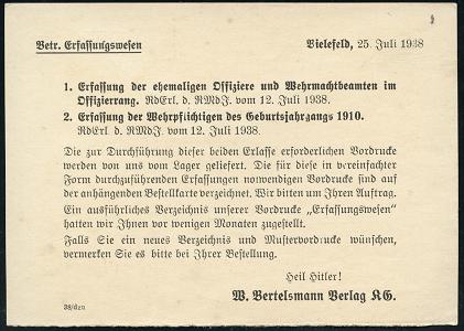 8453 | 16 € | 4800 Bielefeld Post-Freistempel : BIELEFELD 2/ y/ DEUTSCHES REICH 1938 (26.7.) PFS "Achteck" 3 Pf. auf (halber) Firmen-Reklame-Kt. für Formulare zur Erfassung ehem. Offiziere u. Wehrmachtsbeamten.. etc. mit Zusatz "Heil Hitler !" (Dü.D-4) | ![]() ![]() ![]() | |