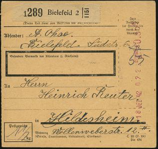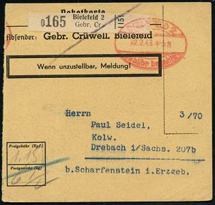 8457 | 18 € | 4800 Bielefeld Post-Freistempel : BIELEFELD 2/ Gebühr bezahlt 1943 (22.2.) aptierter Oval-Brücken-PFS = 2 Sterne entfernt! + schw. Selbstbucher-Paketzettel: Bielfeld 2/ Gebr.Cr. = Crüwell , Inl.-Selbstbucher-Paket-Kt. n. Drehbach/Sachs. (Dü.A-5, Nr.17, aptiert) | ![]() | |