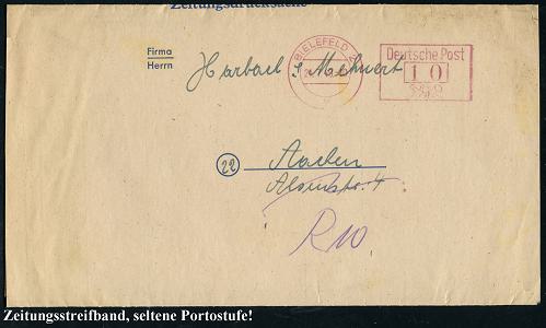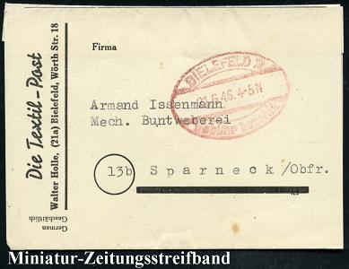 8460 | 16 € | 4800 Bielefeld Post-Freistempel : BIELEFELD 2/ Gebühr bezahlt 1946 (21.6.) aptierter Oval-Brücken-PFS ohne Sterne auf Miniatur-Zeitungs-Streifbandb: Die Textil-Post, Walter Holle.. (Dü.A-5, Nr.17) | ![]() | |