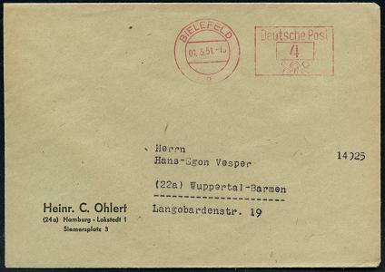 8468 | 10 € | 4800 Bielefeld Post-Freistempel : BIELEFELD / o/ Deutsche Post 1951 (1.3.) PFS Querrechteck "Posthorn" auf Firmen-Bf.: Heinr. C. Ohlert, (24 a( Hamburg-Lokstedt 1.. (Dü.D-14) | ![]() | |