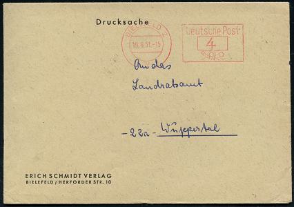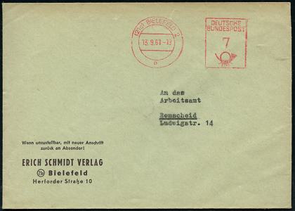 8471 | 8 € | 4800 Bielefeld Post-Freistempel : (21a) BIELEFELD 2/ p/ DEUTSCHE/ BUNDESPOST 1961 (13.9.) PFS Hochrechteck "Posthorn" 7 Pf. auf Firmen-Bf.: ERICH SCHMIDT VERLAG.. (Dü.D-17) | ![]() | |