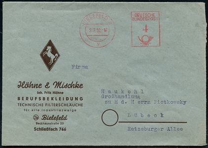 8470 | 10 € | 4800 Bielefeld Post-Freistempel : BIELEFELD 2/ y/ DEUTSCHE/ BUNDESPOST 1952 (2.7.) PFS Hochrechteck "Posthorn" auf Firmen-Bf.: Höhne & Mischke.. BERUFSKLEIDUNG, TECHN. FILTERSCHLÄUCHE.. (Pferde-Logo) (Dü.D-17) | ![]() | |