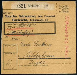 8455 | 25 € | 4800 Bielefeld Post-Freistempel : Bielefeld/ 2. 1944 (14.7.) viol. Anker-Registrierkassen-PFS *0.65 RM + NS-Prägeadler (horizontal) + schw. Paketzettel: Bielefeld 1, klar gest. Inl.-Wert-Paketkt. 50.- RM n. Hildesheim (Dü.H-1A/2) | ![]() | |