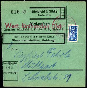 8467 | 18 € | 4800 Bielefeld Post-Freistempel : (21a) BIELEFELD 2/ x/ GEBÜHR BEZAHLT 1950 (30.10.) 2K-PFS auf 2 Pf. NoB + 1L: Wert: fünfhundert DM auf grüner Postgut-Selbstbucher-Paketkt.: Bielefeld 2 (Hbf.)/ Fischer K. G. (Eckbugspur) n. Stuttgart (Dü. Nr.28) | ![]() | |