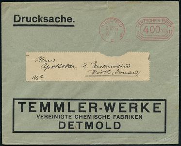 8447 | 20 € | 4800 Bielefeld Post-Freistempel : BIELEFELD/ *2e/ DEUTSCHES REICH 1923 (9.10.) Infla-PFS "Achteck" 400ooo (Mark) mit 2 verschiedenen Nullen, Firmen-Bf.: TEMMLER-WERKE, VEREINIGTE CHEMISCHE FABRIKEN; DETMOLD (kl. Adreßlabel-Ausriß) n. Wörth (Dü.D-3, Nr.119) | ![]() | |