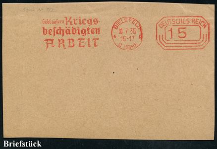 8451 | 16 € | 4800 Bielefeld Post-Freistempel : BIELEFELD/ *p/ 2 HBF/ Gebt unseren Kriegs-/ beschädigten/ ARBEIT 1935 (30.7.) seltener PFS "Achteck" 15 Pf. auf großem Briefstück, vergl. Kat.-Nrn. 8424-25 (Bo.S 152 G, von Mai 1934-37 verwendet) | ![]() | |