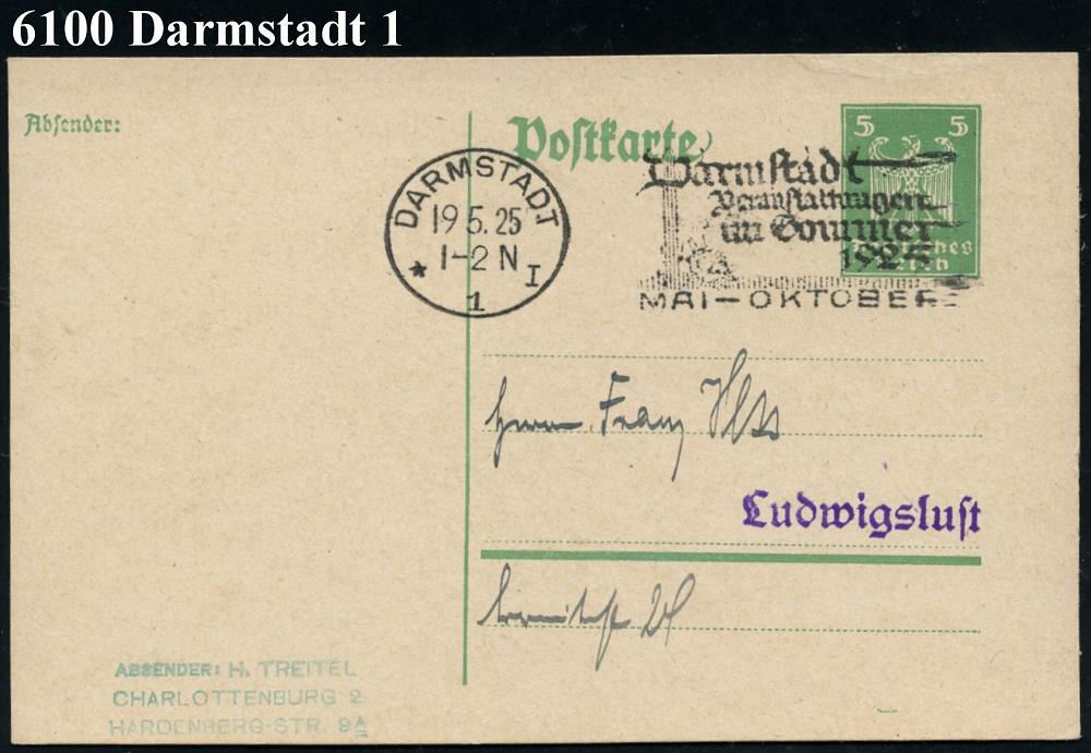 1082 | 20 € | 6100 Darmstadt Maschinen- und Serienstempel : DARMSTADT/ *1I/ Darmstadt/ Veranstaltungen/ im Sommer.. 1925 (19.5.) MWSt = Ludwigsäule auf Inl.-Karte (Bo.6 B, nur 1925 verwendet) | ![]() | |
