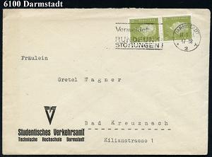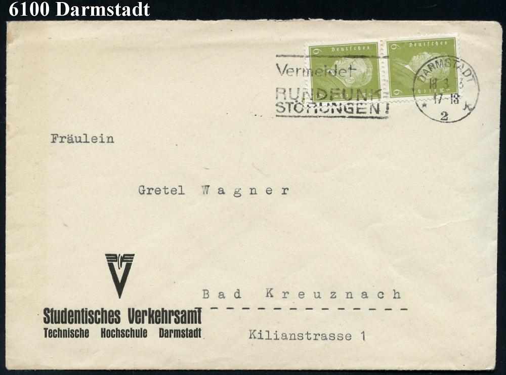 1089 | 14 € | 6100 Darmstadt Maschinen- und Serienstempel : Darmstadt 1933 (18.3.) Vordruck-Bf.: Studentisches Verkehrsamt/Techn. Hochschule (geflügeltes Rad) Fernbf. (Mi.465 MeF) | ![]() | |