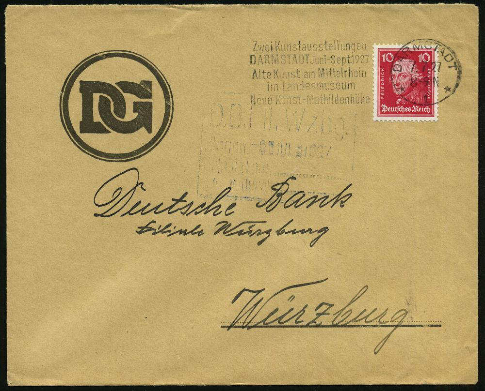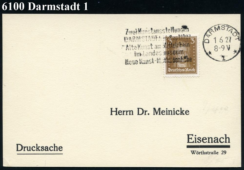 1086 | 20 € | 6100 Darmstadt Maschinen- und Serienstempel : DARMSTADT/ *1*/ Zwei Kunstausstellungen/ ..Alte Kunst am Mittelrhein/ ..Neue Kunst Mathildenhöhe 1927 (7.7.) MWSt auf Firmen-Bf.: D G = D isconto Gesellschaft (= Vorläufer Deutsche Bank) Fern-Bf. (Bo.9 A) | ![]() | |