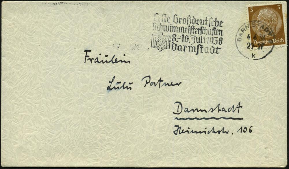 1092 | 15 € | 6100 Darmstadt Maschinen- und Serienstempel : DARMSTADT 2/ k/ Erste Großdeutsche/ Schwimmeisterschaften/ 8.-10.Juli 1938 (Juni) MWSt (NS-Logo) klar gest. Inl.-Bf. (Bo.18 A) | ![]() | |