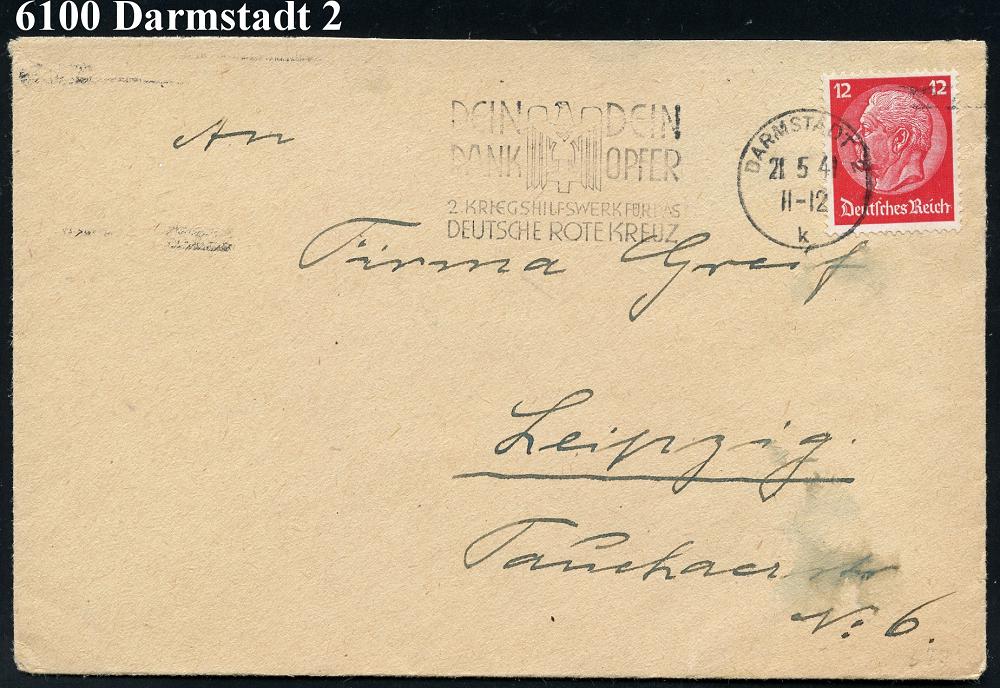 1095 | 16 € | 6100 Darmstadt Maschinen- und Serienstempel : DARMSTADT 2/ k/ DEIN/ DANK/ DEIN/ OPFER/ 2.KRIEGSHILFSWERK FÜR DAS/ DEUTSCHE ROTE KREUZ 1941 (21.5.) MWSt (RK-Adler) auf Bedarfs-Bf. (Bo.S 377 A, nur 41 Tage verwendet) | ![]() | |