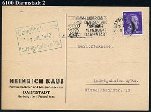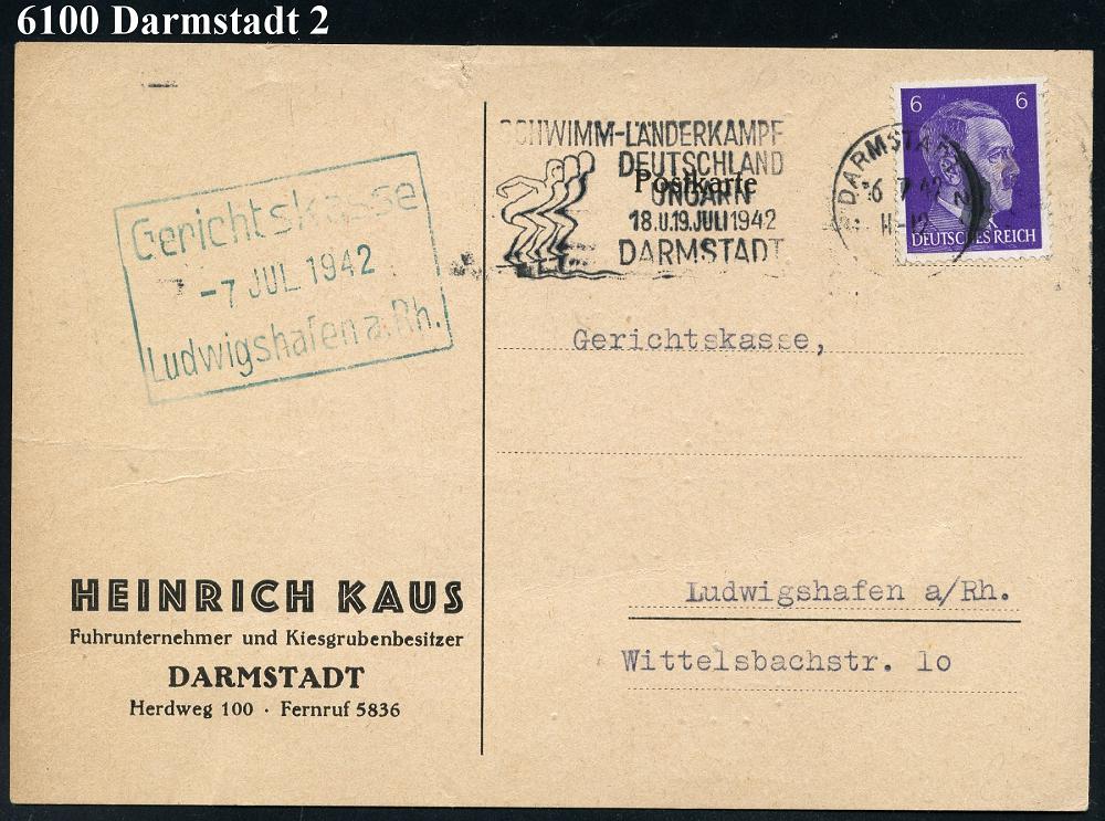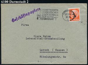 1097 | 18 € | 6100 Darmstadt Maschinen- und Serienstempel : DARMSTADT 2/ k/ REICHSWETTKÄMPFE/ DER DEUTSCHEN/ STUDENTINNEN/ 23.-27.JULI 1941 (6.7.) seltener MWSt = Läuferin , klar gest. Firmen-Kt.: HEINRICH KAUS, Furhunternehmer u. Kiesgrubenbesitzer.. (Bo.22 A) | ![]() | |