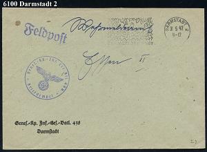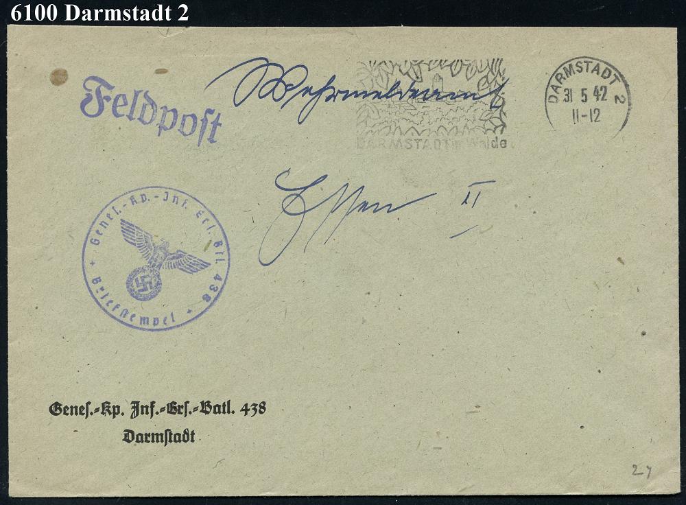 1098 | 15 € | 6100 Darmstadt Maschinen- und Serienstempel : DARMSTADT 2/ k/ DARMSTADT im Walde 1942 (31.5.) MWSt (gering undeutl.) + viol. 1K-HdN: Genes.(enden) Kp.-Jnf.-Ers.-Btl. 438 auf entspr. Feldpost-Vordruck-Bf.! (Bo.29 A I) | ![]() | |