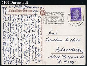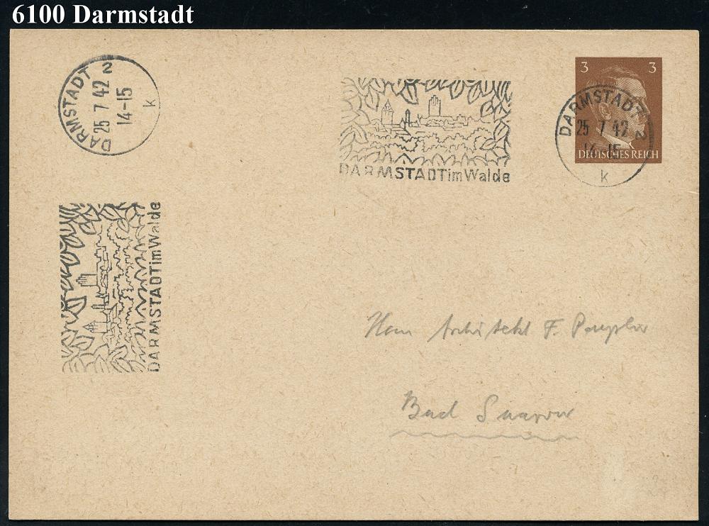 1099 | 18 € | 6100 Darmstadt Maschinen- und Serienstempel : DARMSTADT 2/ k/ DARMSTADT im Walde 1942 (25.7.) MWSt 2x auf PP 3 Pf. Hitler (blanco = Mi.PP 152 A1) Fern-Drs.-Kt. (Bo.29 A I) | ![]() | |