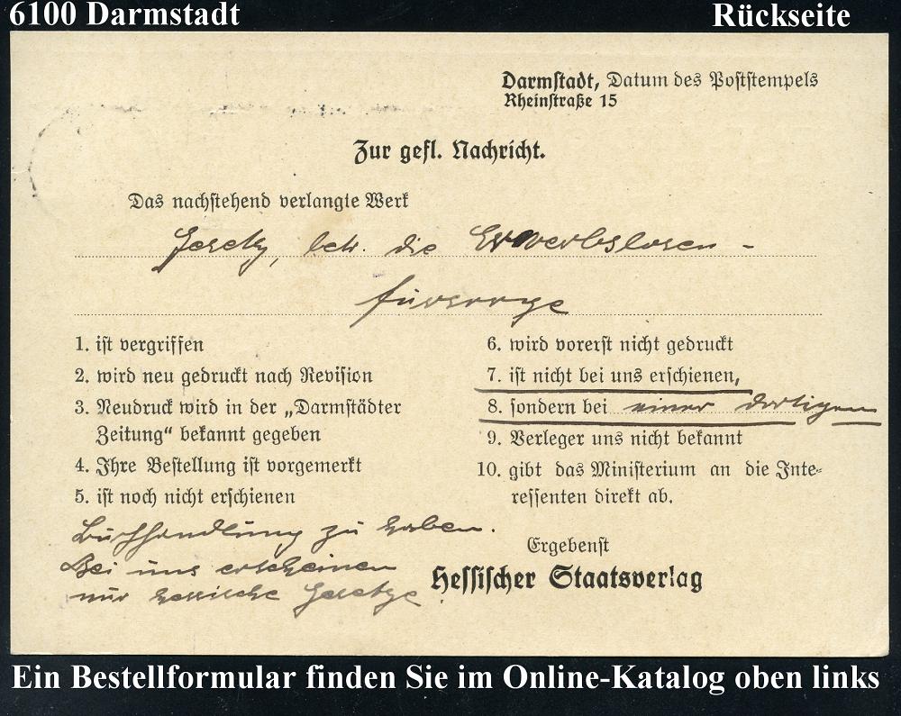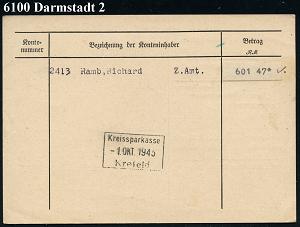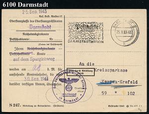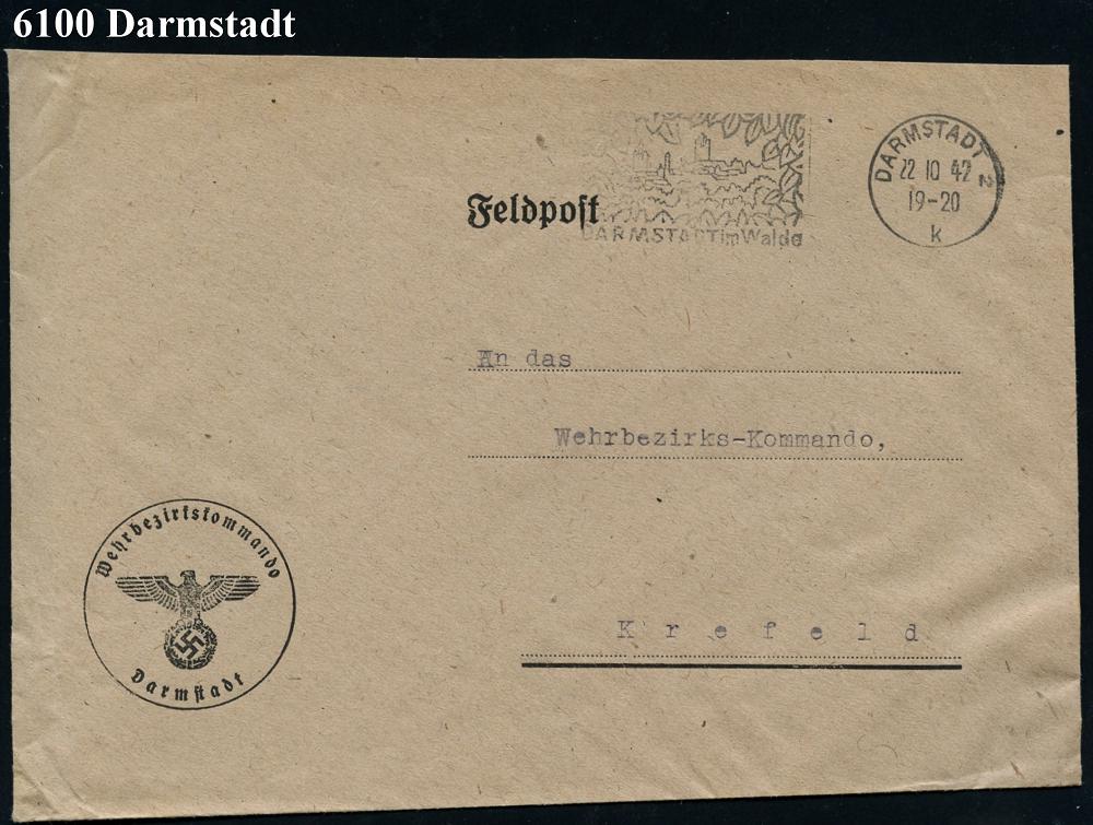 1101 | 18 € | 6100 Darmstadt Maschinen- und Serienstempel : DARMSTADT 2/ k/ DARMSTADT im Walde 1942 (22.10.) MWSt Type I mit 1K-Orts-Stpl. auf Feldpost-Vordruck-Bf.: Wehrbezirkskommando Darmstadt n. Krefeld (Bo.29 A I) | ![]() | |