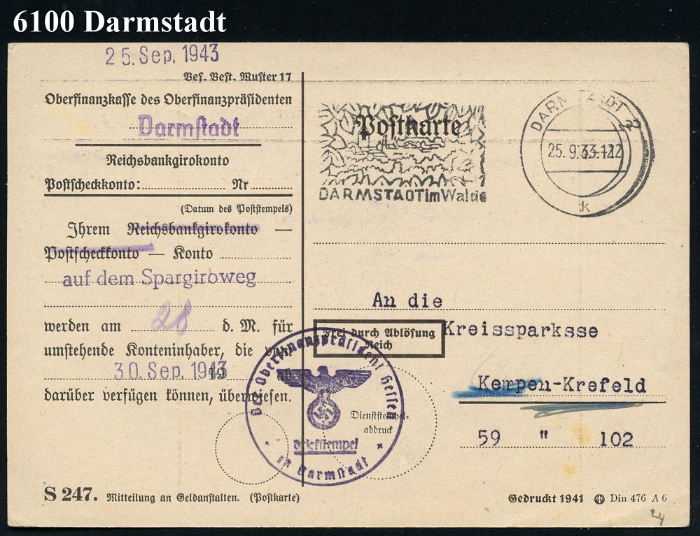 1103 | 15 € | 6100 Darmstadt Maschinen- und Serienstempel : DARMSTADT 2/ k/ DARMSTADT im Walde 1943 (25.9.) MWSt mit 2K-Orts-Stpl. = Stpl.-Irrtum "1933" + 1K-HdN: Der Oberfinanzpräsident Hessen/ in Darmstadt auf Dienst-Kt.: FdAR (Bo.29 A II) | ![]() ![]() | |
