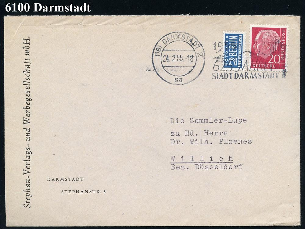 1105 | 12 € | 6100 Darmstadt Maschinen- und Serienstempel : (16) DARMSTADT 2/ sa/ 625 JAHRE/ STADT DARMSTADT 1955 (24.2.) MWSt = Hochzeitsturm (Werbefahne rechte) Firmen-Bf.: Stephan-Verlags-u. Werbeges mbH (Bo.35 B) | ![]() | |