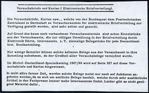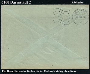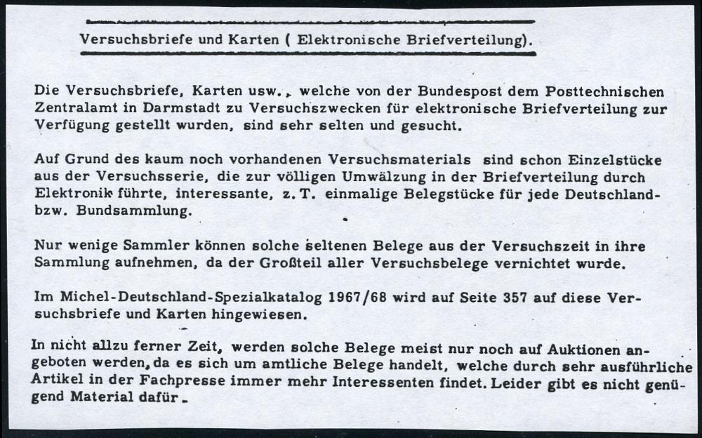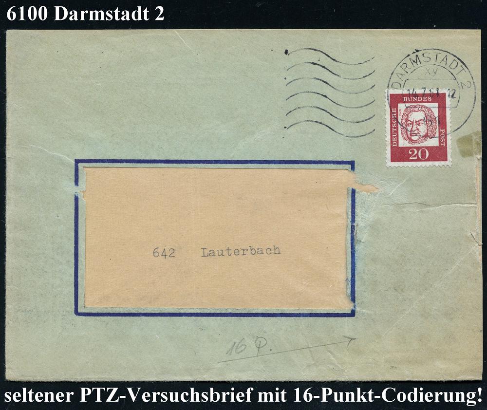 1107 | 50 € | 6100 Darmstadt Maschinen- und Serienstempel : 61 DARMSTADT 2/ xy 1961 (14.7.) Versuchs-MaschinenStpl. auf PTZ-Versuchsbf.: Kurzformat mit Fenster, EF 20 Pf. Bach, Lumo, Versuchs-Bf. mit PTZ-Einlage (Vordruck im Fenster) für PLZ 642 Lauterbach + 16-Punkt Lumo-Code (große Punkte!) übliche Gebrauchs- u. Beförderungsspuren (ohne Bedeutung!), seltener Versuchs-Beleg ! | ![]() ![]() ![]() ![]() | |